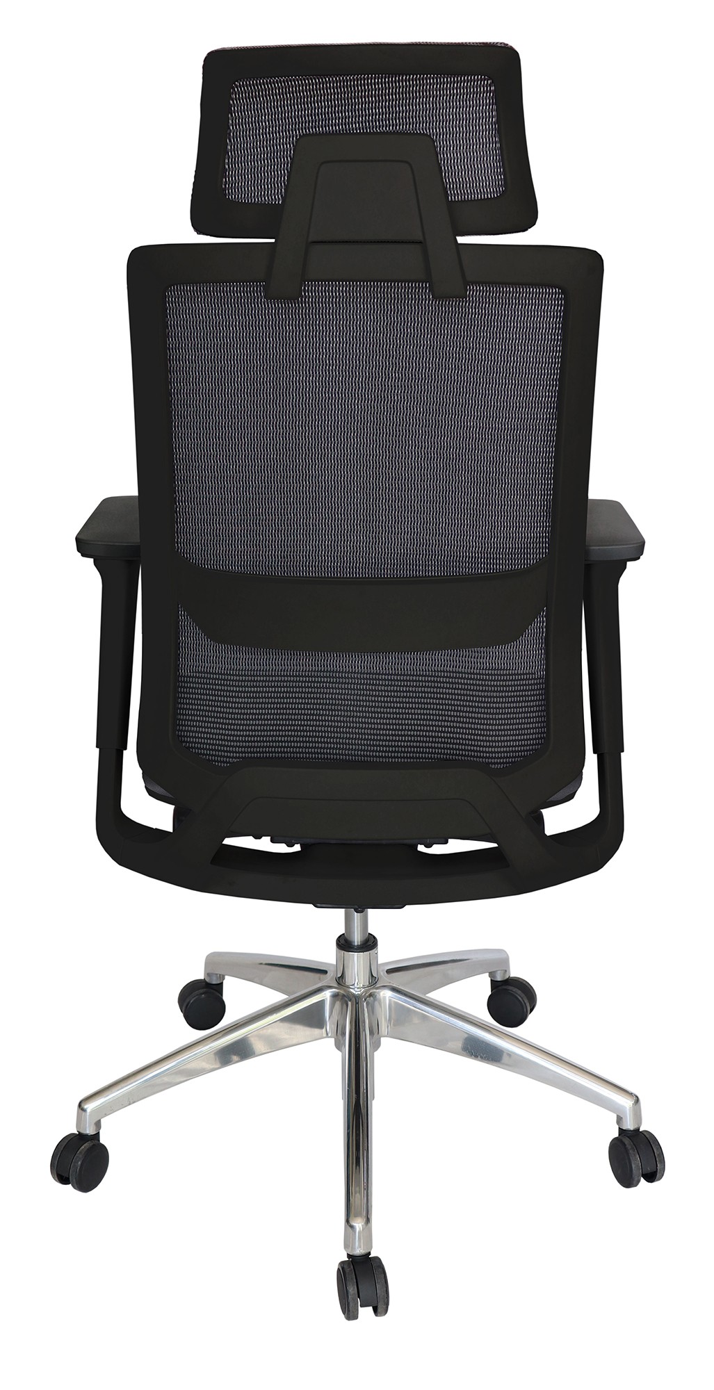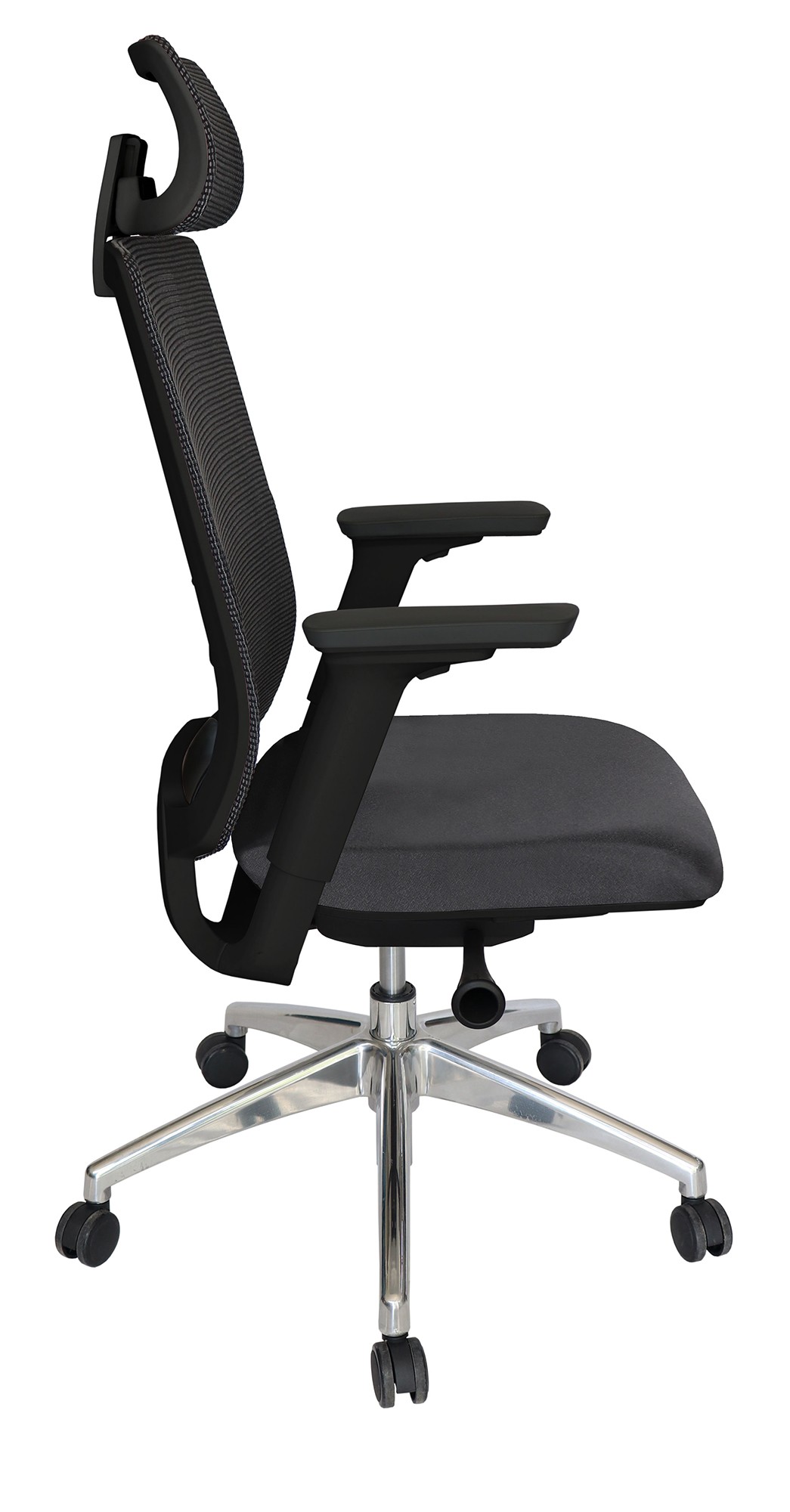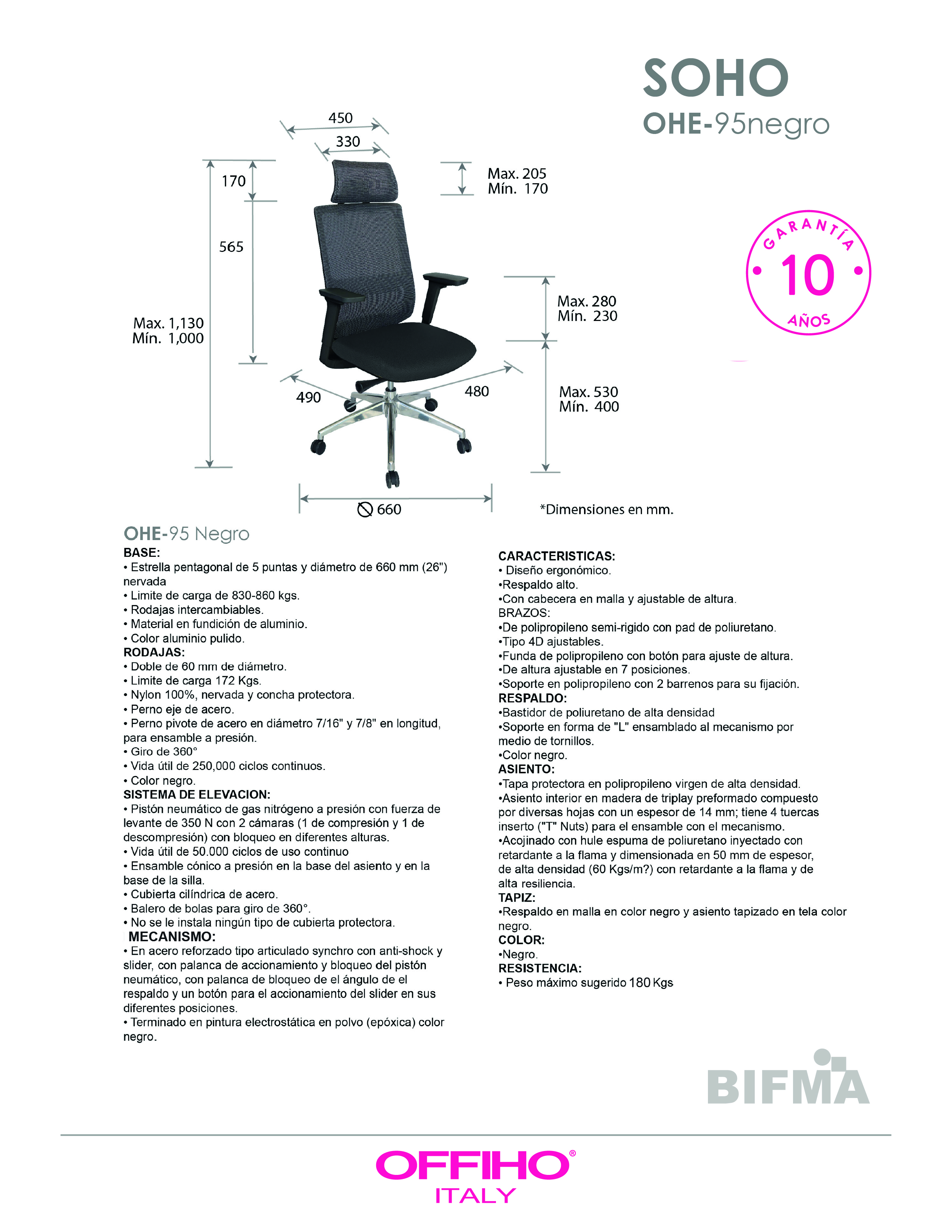 base: estrella de 5 puntas en fundición de aluminio, terminado en aluminio pulido y con rodajas tipo dual. elevación: por medio de pistón neumático que permite ajustar la altura del asiento. mecanismo: de acero reforzado tipo articulado synchro con anti-shock, palanca para accionar pistón neumático y palanca de bloqueo del ángulo del respaldo, asiento slider con botón para el accionamiento. brazos: tipo 4D giratorios y ajustables de altura en polipropileno semi-rígido con pad de poliuretano. respaldo: en malla de diseño ergonómico con cabecera. asiento: hule espuma de poliuretano inyectado flexible con densidad de 60 kgs/m³ con retardante a la flama y alta resiliencia. tapiz: respaldo de malla de color negro y asiento tapizado en tela de color negro. resistencia: peso sugerido 180 kgs.