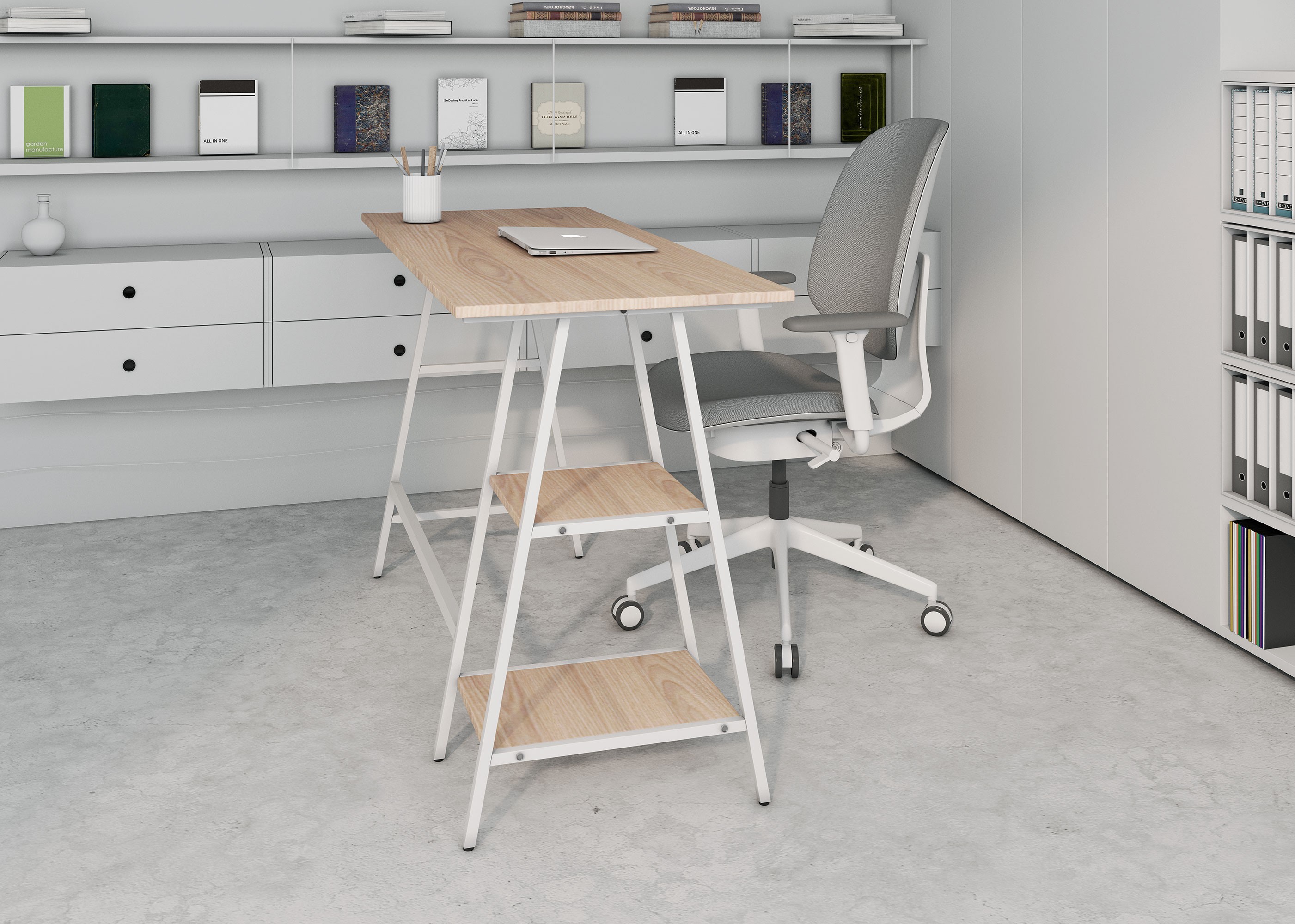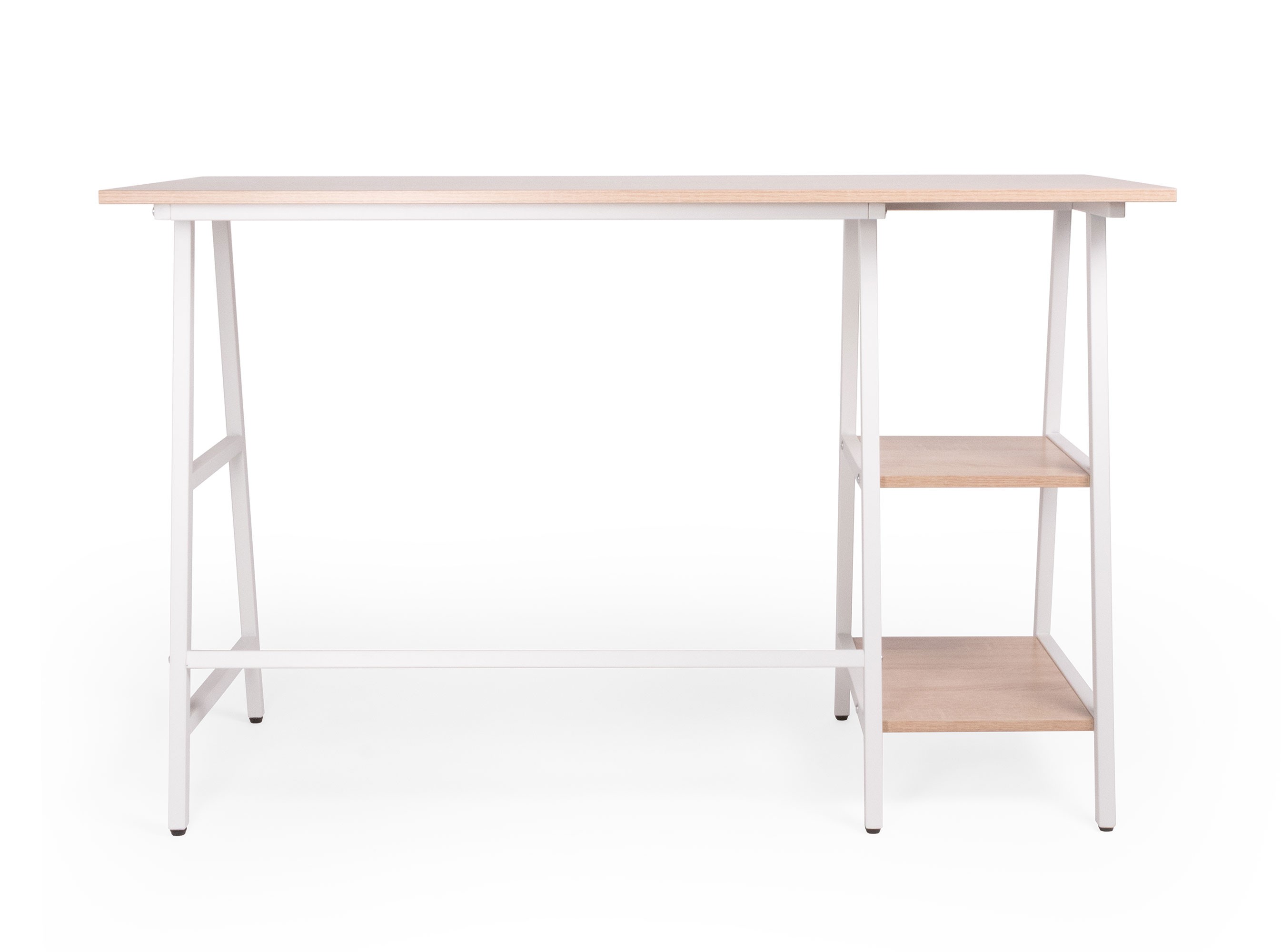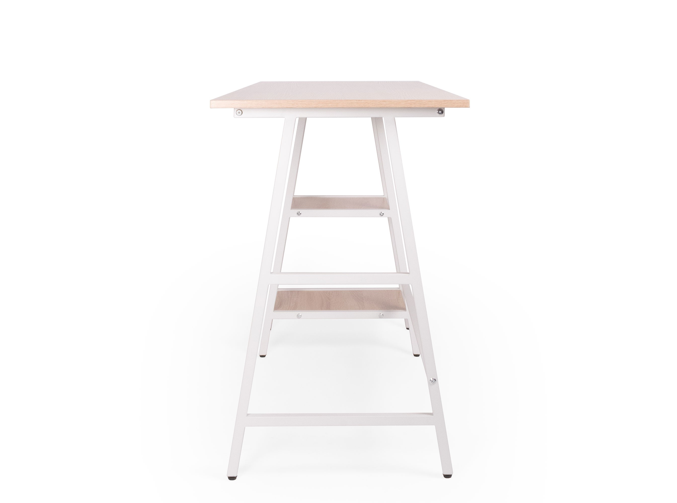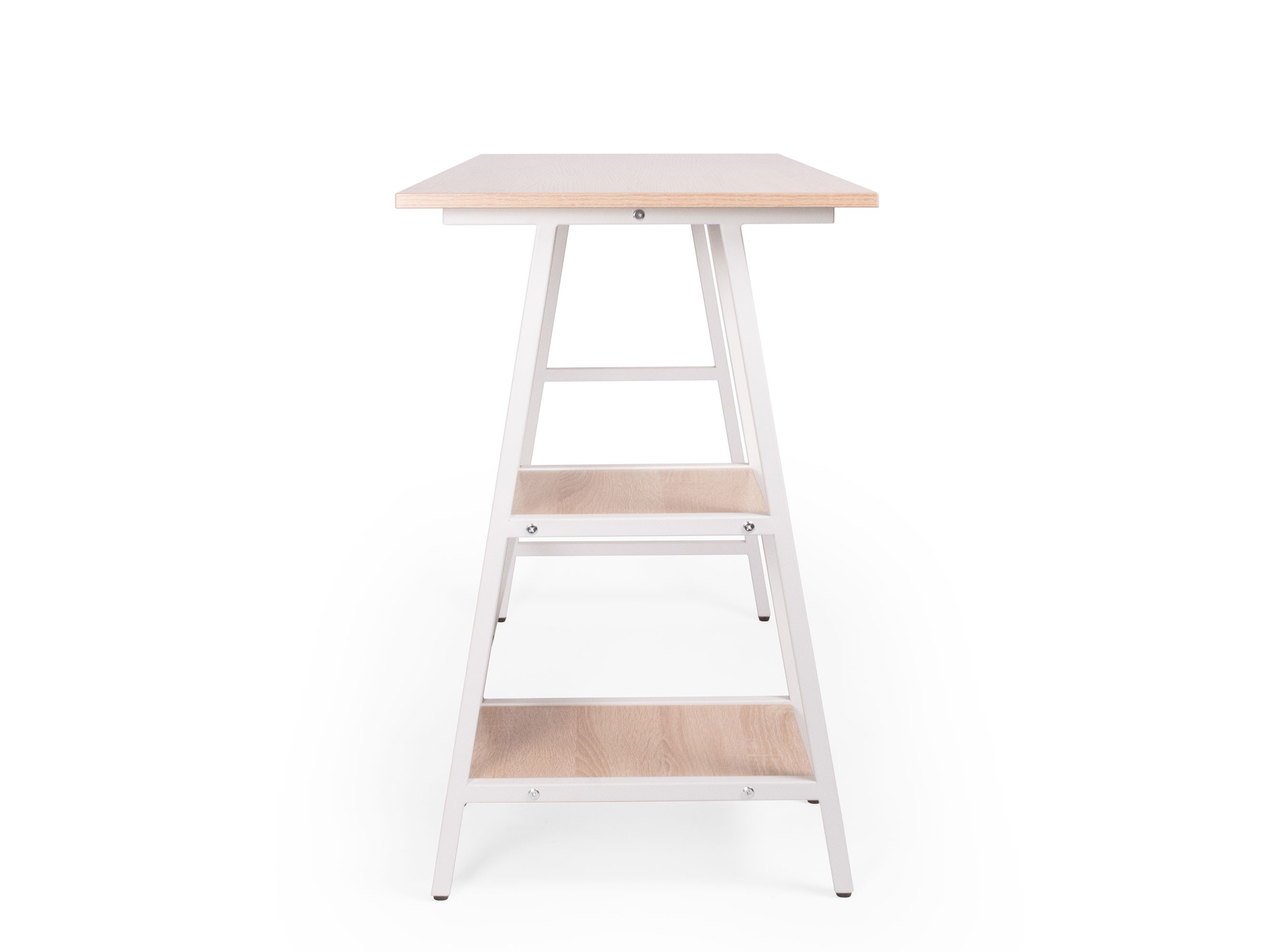 estructura: metálica con travesaños en forma de caballete, en tubular cuadrado metálico 7/8”, acabado con pintura electrostática color blanco. cubierta: rectangular con dos estantes laterales abiertos, laminado plástico baja presión de 16mm MFC. Terminado tipo roble natural claro/ estructura blanca. resistencia: peso sugerido 60 kgs.